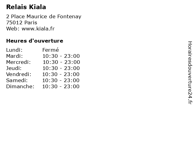 1 Relais Kiala (Distance: 0,45 km) 3 Rue Fabre d'Eglantine, 75012 Paris kiala, relais, services postaux et de livraison 2 Relais Kiala (Distance: 0,74 km) 39 Rue des Boulets, 75011 Paris kiala, relais, services postaux et de livraison 3 Relais Kiala (Distance: 1,65 km) 84 Boulevard Soult, 75012 Paris kiala, relais, services postaux et de livraison 4 Relais Kiala (Distance: 3,06 km) 40 Rue du Faubourg du Temple, 75011 Paris kiala, relais, services postaux et de livraison 5 Relais Kiala (Distance: 3,42 km) 19 De Beaurepaire, 75010 Paris kiala, relais, services postaux et de livraison 6 Relais Kiala (Distance: 3,83 km) 41 Rue Des Bois, 75019 Paris kiala, relais, services postaux et de livraison |