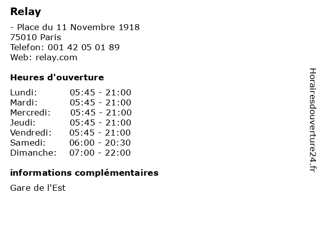 1 Relay (Distance: 0,00 km) - Place du 11 Novembre 1918, 75010 Paris café, journaux, magasines, presse, relay, sandwiches, viennoiseries 2 Relay (Distance: 0,60 km) 200 Rue du Faubourg Saint Denis, 75010 Paris beverages, food, gifts, paper, printing, relay, service products, telephone 3 Relay (Distance: 0,80 km) 112 Rue de Maubeuge, 75010 Paris cafe, chaussures, enfants, homme, lingerie, mode femme, relay, restaurant, service 4 Relay (Distance: 2,35 km) 13 Rue d'Amsterdam, 75008 Paris cafe, chaussures, enfants, homme, mode femme, relay, restaurant, service, sport 5 Relay (Distance: 2,35 km) 13 Rue d'Amsterdam, 75008 Paris café, gm, journaux, magasines, presse, relay, rome, sandwiches, viennoiseries 6 Relay (Distance: 2,35 km) 13 Rue d'Amsterdam, 75008 Paris café, journaux, magasines, payot, presse, relay, sandwiches, viennoiseries |