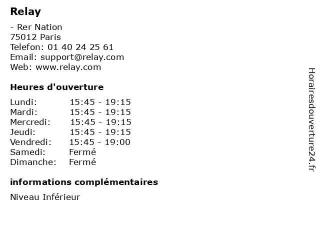 1 Relay (Distance: 0,07 km) - Place de la Nation, 75012 Paris café, journaux, magasines, presse, relay, sandwiches, viennoiseries 2 Relay (Distance: 0,07 km) - Place de la Nation, 75012 Paris café, journaux, magasines, presse, relay, sandwiches, viennoiseries 3 Relay (Distance: 0,63 km) 51 Rue de Picpus, 75012 Paris beverages, food, gifts, paper, printing, relay, service products, telephone 4 Relay (Distance: 1,02 km) 26 Avenue du Dr Arnold Netter, 75012 Paris beverages, food, gifts, paper, printing, relay, service products, telephone 5 Relay (Distance: 1,57 km) n/a Pere Lachaise, 75020 Paris beverages, food, gifts, paper, printing, relay, service products, telephone 6 Relay (Distance: 1,64 km) 20 Bd Diderot, 75012 Paris beverages, food, gifts, paper, printing, relay, service products, telephone |