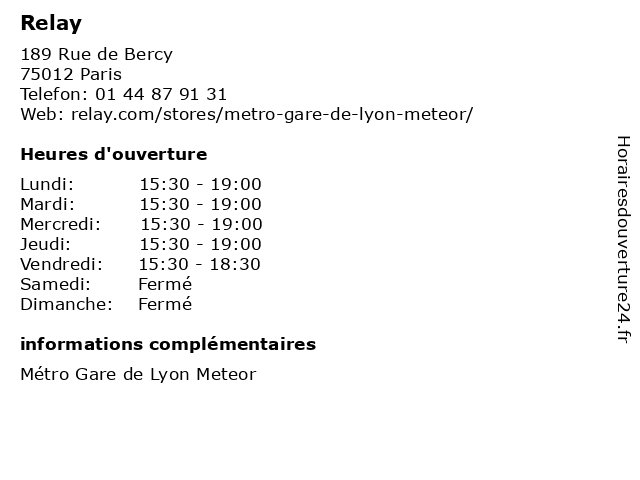 1 Relay (Distance: 0,24 km) - Place Louis Armand, 75012 Paris café, journaux, magasines, presse, relay, sandwiches, viennoiseries 2 Relay (Distance: 0,24 km) - Place Louis Armand, 75012 Paris café, journaux, magasines, presse, relay, sandwiches, viennoiseries 3 Relay (Distance: 0,24 km) - Place Louis Armand, 75012 Paris café, journaux, magasines, presse, relay, sandwiches, viennoiseries 4 Relay (Distance: 0,24 km) - Place Louis Armand, 75012 Paris café, journaux, magasines, presse, relay, sandwiches, viennoiseries 5 Relay (Distance: 0,24 km) - Place Louis Armand, 75012 Paris café, journaux, magasines, presse, relay, sandwiches, viennoiseries 6 Relay (Distance: 0,31 km) 20 Bd Diderot, 75012 Paris beverages, food, gifts, paper, printing, relay, service products, telephone |