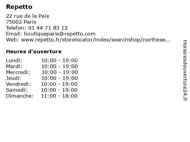 1 Repetto (Distance: 1,97 km) 51 rue du Four, 75006 Paris chaussures, garde-robe, maroquinerie, parfum, repetto 2 Repetto (Distance: 2,28 km) 51 rue des Francs Bourgeois, 75004 Paris chaussures, garde-robe, maroquinerie, parfum, repetto 3 Repetto (Distance: 3,64 km) 20 rue de Charonne, 75011 Paris chaussures, garde-robe, maroquinerie, parfum, repetto 4 Repetto (Distance: 3,96 km) 36 rue de Passy, 75016 Paris chaussures, garde-robe, maroquinerie, parfum, repetto 5 Repetto - GALERIES LAFAYETTE - HAUSSMANN (Distance: 0,43 km) 40 boulevard Haussmann, 75009 Paris chaussures, galeries, garde-robe, haussmann, lafayette, maroquinerie, parfum, repetto 6 Repetto - GALERIES LAFAYETTE - STAND SIX PIEDS TROIS POUCES (Distance: 0,43 km) 40 Boulevard Haussmann, 75009 Paris chaussures, galeries, garde-robe, lafayette, maroquinerie, parfum, pieds, pouces, repetto, six, stand, trois |