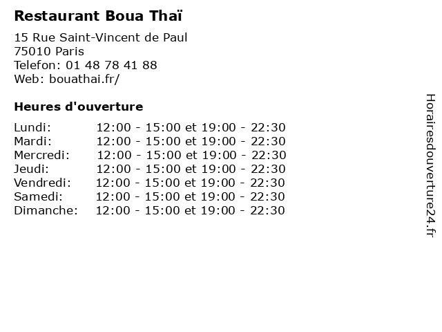 1 Restaurant Boua Thaï (Distance: 0,00 km) 15 Rue Saint Vincent De Paul, 75010 Paris bar, bistro, bistrot, boua, brasserie, café, pub, restaurant, restauration, resto, thaï 2 Thaï Richer (Distance: 0,87 km) 14 Rue Richer, 75009 Paris asian, business, foods, restaurants, richer, thaï 3 Thaï one (Distance: 1,45 km) 46 Rue de Cléry, 75002 Paris asian, business, foods, one, restaurants, thaï 6 |