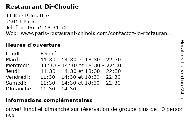 | Vendredi | 11:30-14:30 et 18:30-22:30 |