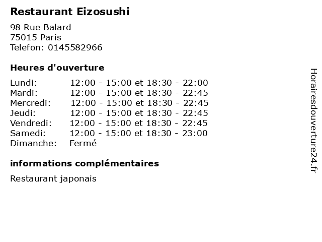 Jeudi | 12:00-15:00 et 18:30-22:45 |