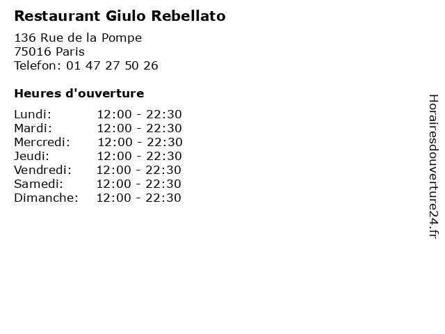1 Giulio Rebellato (Distance: 0,00 km) 136 Rue de la Pompe, 75116 Paris bar, bistro, bistrot, brasserie, café, giulio, pub, rebellato, restaurant, restauration, resto 2 La Pizzeria di Rebellato (Distance: 0,02 km) 138 Rue de la Pompe, 75016 Paris di, la, pizza, pizzeria, rebellato, restaurante 3 La Famiglia di Rebellato (Distance: 4,59 km) 37 Rue Berger, 75001 Paris di, famiglia, la, pizza, rebellato, restaurante 4 Brasserie Le Germinal (Distance: 2,46 km) 95 Avenue Emile Zola, 75015 Paris brasserie, germinal, le, restaurant, traditionnel 5 Saïdoune Restaurant (Distance: 3,04 km) 35 Rue Legendre, 75017 Paris libanais, restaurant, saidoune, saïdoune, traditionnel, traiteur 6 Le Mesturet (Bistrot Restaurant Traditionnel Paris) (Distance: 4,15 km) 77 Rue de Richelieu, 75002 Paris bistrot, food, le, mesturet, paris, restaurant, traditionnel |
