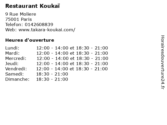 | Mardi | 12:00-14:00 et 18:30-21:00 |