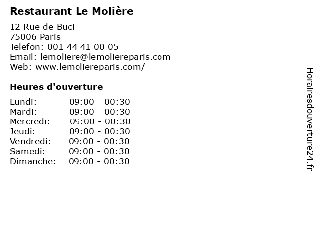 1 Restaurant Le Molière (Distance: 0,97 km) 40 Rue Saint Honore, 75001 Paris bar, bistro, bistrot, brasserie, café, le, molière, restaurant, restauration 3 Pharmacie Molière (Distance: 5,03 km) 20 Rue Moliere, 92120 Montrouge herboristerie, molière, médicaments, paramédical, parapharmacie, pharmacie, pharmacien, santé, traitements 4 Hotel Résidence Molière (Distance: 5,03 km) 28 Rue Molière, 92120 Montrouge bar, hotel, molière, restaurant, résidence, service 5 Galerie Molière (Distance: 5,37 km) 99 Rue des Rosiers, 93400 Saint-Ouen architecture, art forain, bijoux, céramiques, galerie, mobilier, molière, peintures & arts graphiques 6 Galerie Molière (Distance: 5,37 km) 99 Rue des Rosiers, 93400 Saint-Ouen architecture, art forain, bijoux, céramiques, galerie, mobilier, molière, peintures & arts graphiques |