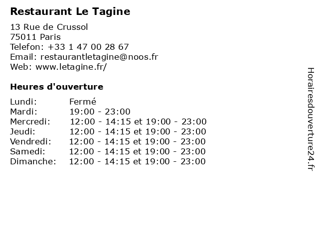 | Dimanche | 12:00-14:15 et 19:00-23:00 |
