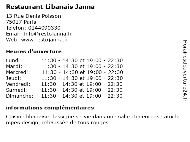 | Mardi | 11:30-14:30 et 19:00-22:30 |