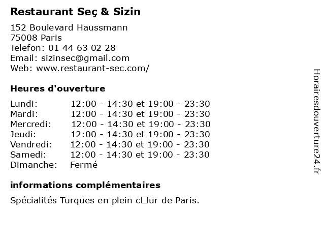 | Mardi | 12:00-14:30 et 19:00-23:30 |
