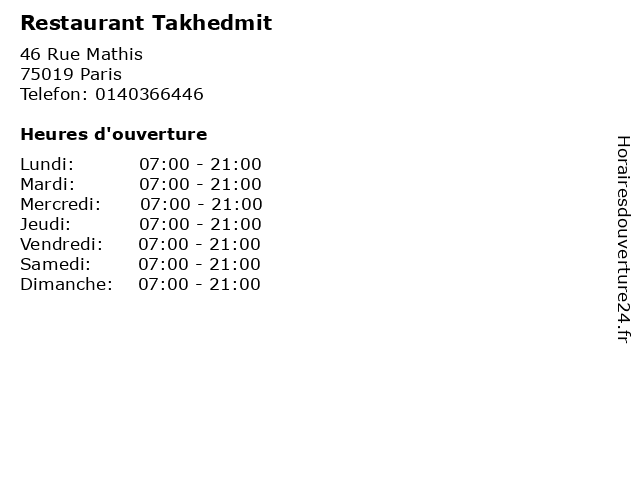 | Mardi | 07:00-21:00 |