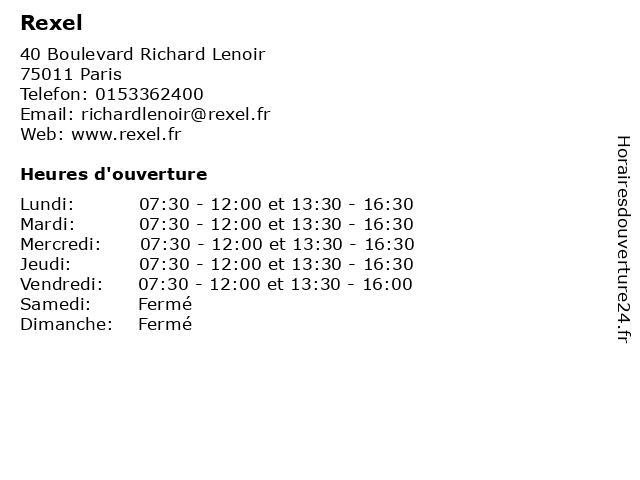 1 3 Rexel (Distance: 5,86 km) 10 Rue Waldeck Rochet, 93300 Aubervilliers bricolage, loisirs, rexel, services 4 Rexel (Distance: 5,99 km) 14 Rue De La Mont Joie, 93210 Saint Denis bricolage, loisirs, rexel, services 5 6 |