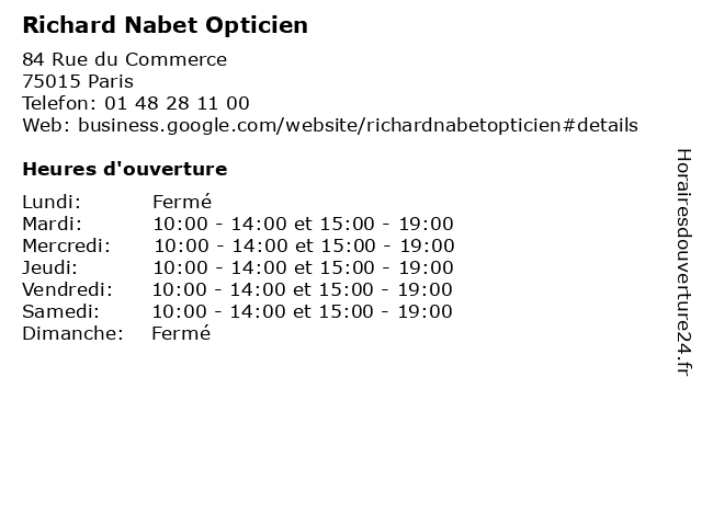 1 Opticien PARIS 15 | Alain Afflelou (Distance: 0,02 km) 89 Rue Du Commerce, 75015 PARIS 15, afflelou, alain, magasin de lunettes de soleil, magasin d’accessoires de mode, opticien, optométrie, paris 2 Opticien Krys (Distance: 0,10 km) 2 Place Etienne Pernet, 75015 Paris krys, magasin de lentilles correctrices, magasin de lunettes de soleil, magasin d’accessoires de mode, opticien, optométrie 3 Imprimerie Richard (Distance: 0,37 km) 13 Rue Charles Lecocq, 75015 Paris impression, imprimerie, imprimeurs, richard, vinyle 4 Dr Richard Berdugo - Chirurgien-dentiste (Distance: 0,54 km) 105 Rue de la Convention, 75015 Paris berdugo, chirurgien, dentiste, dr, médecin, médecine, médical, pharmaceutique, richard, traitement 5 Emmanuel Richard-Zuber - Masseur-kinésithérapeute (Distance: 0,57 km) 136b Rue Blomet, 75015 Paris bien-être, emmanuel, en, forme, kinésithérapeute, kinésithérapie, masseur, remise, richard, rééducation, zuber 6 Opticien Générale d'Optique BEAUGRENELLE (Distance: 0,71 km) 52 Rue Linois, 75015 Paris beaugrenelle, d'optique, générale, opticien |