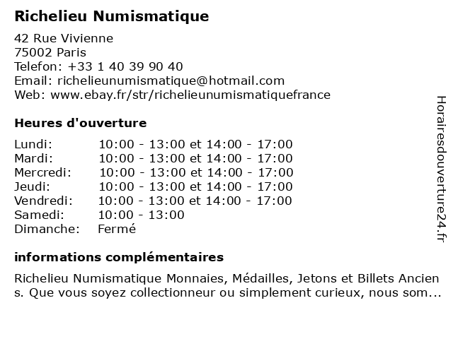 1 CGB Numismatique (Distance: 0,07 km) 36 Rue Vivienne, 75002 Paris billets, boutique, cgb, collection, medailles, monnaies, numismatique 2 Olivier Goujon Numismatique (Distance: 0,11 km) 4 rue des Panoramas, 75002 Paris achat, argent, bijoux, collection, goujon, magasin, médailles, numismatique, olivier, pièces, vente 3 Atsuatsu Richelieu (Distance: 0,19 km) 30 Rue Saint Marc, 75002 Paris atsuatsu, restaurants, richelieu 4 Vinchon Jean Numismatique (Distance: 0,33 km) 77 Rue de Richelieu, 75002 Paris jean, numismatique, vinchon 5 Atelier Richelieu (Distance: 0,38 km) 60 Rue de richelieu, 75002 Paris atelier, organisateur, professionnels, richelieu, événements 6 Bistrot Richelieu (Distance: 0,65 km) 45 Rue de Richelieu, 75001 Paris bistrot, business, food, restaurants, richelieu, soup |