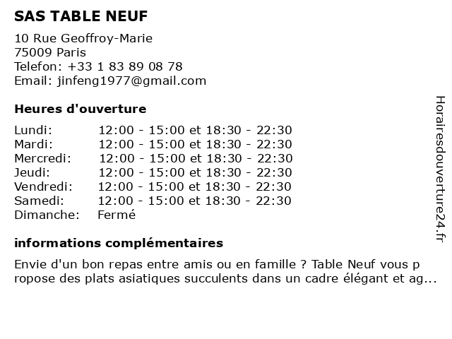 | Samedi | 12:00-15:00 et 18:30-22:30 |