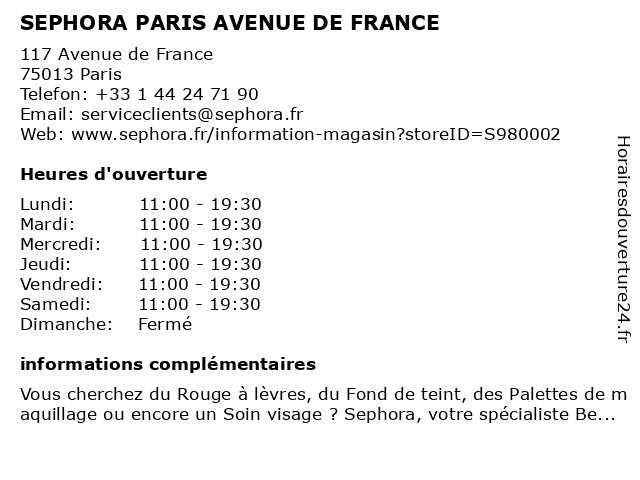 1 SEPHORA PARIS ITALIE 2 (Distance: 1,55 km) 30 Avenue d'Italie, 75013 Paris beauté, carte cadeau, coffret, italie, maquillage, parfum, parfumerie, paris, sephora, soin 2 SEPHORA PARIS GENERAL LECLERC (Distance: 3,47 km) 3 Rue Brézin, 75014 Paris beauté, carte cadeau, coffret, general, leclerc, maquillage, parfum, parfumerie, paris, sephora, soin 3 Regus - 64 Avenue Parmentier (Distance: 3,59 km) 64 Avenue Parmentier, 75011 Paris 64, avenue, espace de coworking, parmentier, regus 4 Sephora (Distance: 3,92 km) 56 - 58 rue Saint Denis, 75001 Paris accessoires, maquillage, mode, parfum, sephora 5 Sephora (Distance: 3,97 km) 235 Rue Etienne Marcel, 93556 Montreuil accessoires, cafe, chaussures, hauts, homme, lingerie, mode femme, restaurant, sephora 6 Sephora (Distance: 4,02 km) 1 Rue Pierre Lescot, 75001 Paris cosmétique, maquillage, parfumerie, sephora |