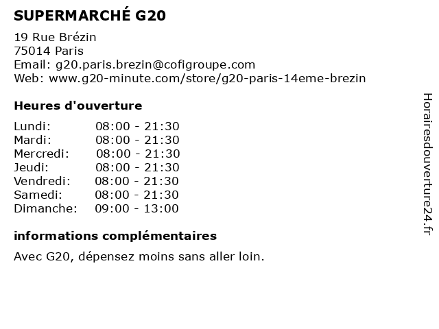3 SUPERMARCHÉ G20 (Distance: 1,06 km) 42 Avenue Reille, 75014 Paris catalogue g20, courses pas cher, g20, g20 commande en ligne, g20 course en ligne, g20 courses en ligne, g20 drive, g20 fr, g20 livraison, g20 livraison à domicile, g20 minute, g20 produits, g20 supermarche, magasin alimentaire en ligne, super marche g20, supermarche, supermarché, supermarché g20 promotions, supermarché magasin, supermarchés g20, épicerie livraison à domicile 5 Supermarché G20 (Distance: 1,83 km) 10 rue Jean Bart, 75006 Paris carte bleue, carte g2, dépôt de pain, dépôt pressing, g20, livraison à domicile, photocopieur, supermarché, supermarket 6 |