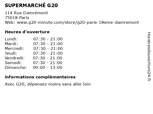 2 SUPERMARCHÉ G20 (Distance: 0,54 km) 6 Rue Versigny, 75018 Paris alimentation g20, catalogue g20, g20, g20 a proximité, g20 catalogue, g20 enseigne, g20 le plus proche, g20 produits, g20 supermarché groupe, groupe g20, magasin alimentaire le plus proche, magasin ouvert supermarché, magasin pour les courses, magasin supermarché le plus proche, magasin supermarket, super g20, superette proximité, supermarches a proximite, supermarché, supermarché proximité ouvert, supermarchés g20 5 SUPERMARCHÉ G20 (Distance: 1,21 km) 162 Rue du Docteur Bauer, 93400 Saint-Ouen-sur-Seine g20, supermarché 6 |
