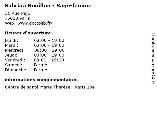 1 Sabrina Bouillon - Sage-femme (Distance: 4,47 km) 1 Bis Allée Alquier-Debrousse, 75020 Paris bouillon, du, femme, maternité, périnée, rééducation, sabrina, sage, uro-gynécologique 2 Galan Virginie Sabrina (Distance: 0,84 km) 18 Rue Labat, 75018 Paris galan, restaurants, sabrina, virginie 3 Restaurant Bouillon Chartier (Distance: 1,36 km) 5 rue du 8 mai 1945, 75010 Paris bouillon, brasserie, café, chartier, restaurant, restaurants, restauration 4 Bouillon 47 - Restaurant de Chef (Distance: 1,53 km) 47 Rue de Rochechouart, 75009 Paris 47, bistrot, bouillon, brasserie, café, chef, de, restaurant, restauration 5 Restaurant Bouillon Pigalle (Distance: 1,85 km) 22 Boulevard de Clichy, 75018 Paris bistrot, bouillon, brasserie, café, pigalle, restaurant, restauration 6 Restaurant Bouillon Julien (Distance: 2,03 km) 16 Rue du Faubourg Saint-Denis, 75010 Paris bar, bouillon, brunch, julien, restaurant, restauration |