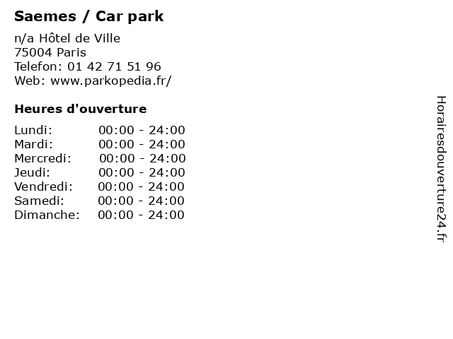 1 Saemes Car Park (Distance: 0,67 km) 6 Quai de Gesvres, 75004 Paris car, park, parking, saemes, services 2 Saemes Car Park (Distance: 0,69 km) 37 Boulevard St Germain, 75005 Paris car, park, parking, saemes, services 3 Saemes Car Park (Distance: 0,73 km) . Place du parvis Notre Dame, 75004 Paris car, park, parking, saemes, services 4 6 Saemes Car Park (Distance: 0,95 km) . Rue Jacques Henri Lartigue, 75005 Paris car, park, parking, saemes, services |