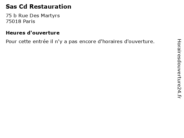 1 Sas Cd Restauration (Distance: 7,96 km) 53 Avenue De Fontainebleau, 94270 Le Kremlin Bicetre cd, restaurants, restauration 2 Sante Restauration Services (Distance: 0,03 km) 77 Rue Des Martyrs, 75018 Paris restaurants, restauration, sante, services 3 Restauration Rapide (Distance: 0,11 km) 65 Rue Des Martyrs, 75009 Paris cheio, rapide, restaurants, restauration, vincent 6 |