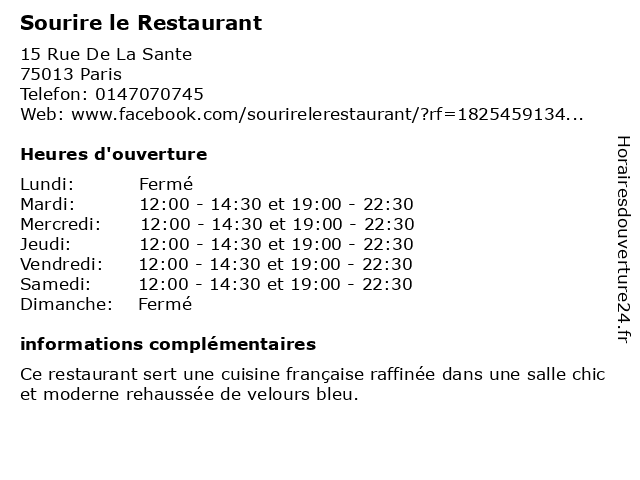 1 Sourire - le Restaurant (Distance: nan km) 15 rue de la Santé, 75013 Paris brasserie, café, le, restaurant, restauration, sourire, traditionnel 2 Au Pays du Sourire (Distance: 1,54 km) 32 Rue de Bièvre, 75005 Paris au, du, pays, restaurant chinois, sourire, spécialité tonkinois 3 Sourire Restaurant et Bar (Distance: 1,60 km) 27 Rue Galande, 75005 Paris bar, boissons, et, nourriture, restaurant, restauration, sourire, tapas 4 Au Sourire D'Alounine (Distance: 1,67 km) 7 Boulevard de l'Hôpital, 75013 Paris au, cafe, chaussures, d'alounine, enfants, homme, lingerie, mode femme, restaurant, service, sourire 6 Restaurant Sourire d'Asie (Distance: 3,70 km) 18 Rue Taine, 75012 Paris asiatique, asie, d', d'asie, grill, restaurant, restaurants, sauté, sourire, wok |