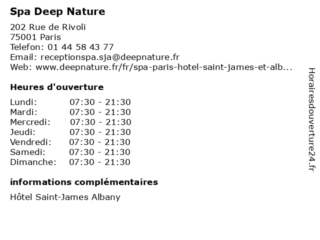 1 Spa Deep Nature (Distance: 0,73 km) 2 Rue Scribe, 75009 Paris beaute, deep, esthetique, nature, soins, spa 2 Spa Deep Nature (Distance: 1,17 km) 24 Boulevard Malesherbes, 75008 Paris beaute, boutique, deep, nature, soins, spa 3 Nature et Découvertes (Distance: 0,03 km) 10 Rue de la Résistance, 75001 Paris découvertes, et, nature, paris 6 Nature et Découvertes Carrousel du Louvre (Distance: 0,34 km) 99 Rue de Rivoli, 75001 Paris carrousel, du, découvertes, et, louvre, nature |