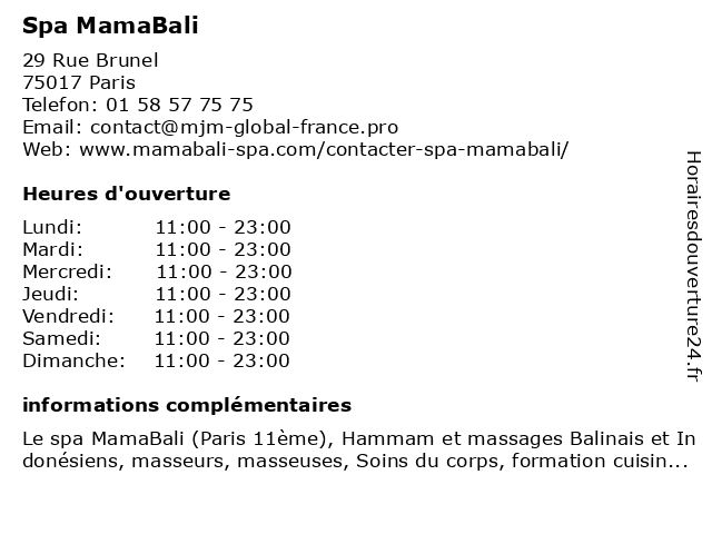 1 Spa Mamabali (Distance: 6,97 km) 8 Rue Guillaume Bertrand, 75011 Paris beaute, mamabali, massages, sauna, spa 2 Spa MamaBali (Distance: 6,97 km) 8 Rue Guillaume Bertrand, 75011 Paris 11, beautysalon, mamabali, massage, paris, shop, spa, wellnes 3 Lok siam spa (Distance: 0,28 km) 17 rue Guersant, 75017 Paris lok, massage, relaxation, siam, soins, spa 4 Hammam & spa Les Sources de l'Orient (Distance: 0,34 km) 17 rue acacias, 75017 Paris aquabike, aquabiking, de, hammam, l'orient, les, massages, sauna, sources, spa 6 Urban Thai Spa (Distance: 0,53 km) 20 avenue Mac Mahon, 75017 Paris massage, relaxation, soins, spa, thai, urban |