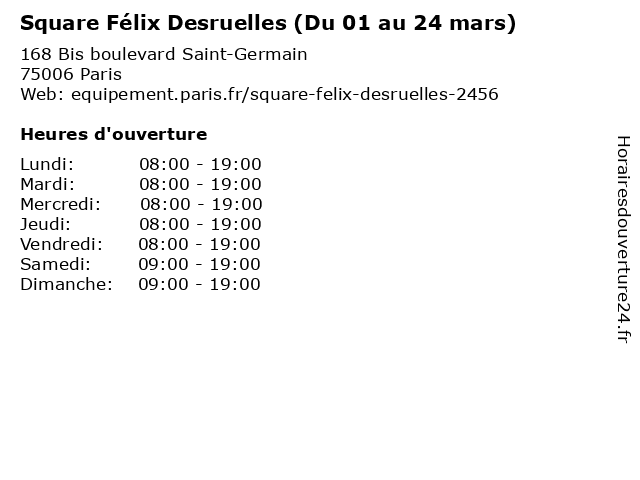 1 Square Félix Desruelles (Du 25 mars au 29 avril et septembre) (Distance: 0,00 km) 168 Bis boulevard Saint-Germain, 75006 Paris 25, 29, au, avril, desruelles, du, et, félix, jardin, mars, parc, septembre, square 2 Square Laurent Prache (Du 01 au 24 mars) (Distance: 0,13 km) 1 place Saint-Germain des Prés, 75006 Paris 01, 24, au, du, jardin, laurent, mars, parc, prache, square 3 Jardin Alice-Saunier-Seïté (Du 01 au 24 mars) (Distance: 0,25 km) 8-10-12 rue Visconti, 75006 Paris 01, 24, alice, au, du, jardin, mars, parc, saunier, seïté, square 4 Jardin du Luxembourg (mars) (Distance: 0,28 km) - Quartier de l'Odéon, 75006 Paris du, jardin, luxembourg, mars, ouverture, public 5 Square Taras Chevtchenko (Du 01 au 24 mars) (Distance: 0,34 km) 186 boulevard Saint-Germain, 75006 Paris 01, 24, au, chevtchenko, du, jardin, mars, parc, square, taras 6 Square Gabriel Pierne (Du 01 au 24 mars) (Distance: 0,39 km) 5 rue de Seine, 75006 Paris 01, 24, au, du, gabriel, jardin, mars, parc, pierne, square |