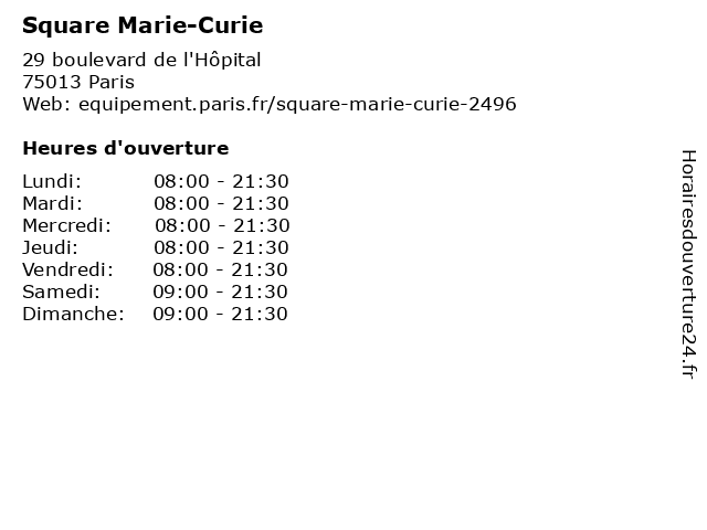 1 Square Saint-Médard (Du 29 octobre au 28 février) (Distance: 0,85 km) 32 rue Censier, 75005 Paris 28, 29, au, du, février, jardin, médard, octobre, parc, saint, square 2 Square Saint-Médard (Du 01 au 24 mars) (Distance: 0,85 km) 32 rue Censier, 75005 Paris 01, 24, au, du, jardin, mars, médard, parc, saint, square 3 Institut Curie (Distance: 1,40 km) 26 Rue d'Ulm, 75248 Paris clinique, curie, hôpitaux, institut, santé, services 4 Musée Curie - Institut Curie (Distance: 1,42 km) 1 Rue Pierre et Marie Curie, 75005 Paris art, curie, establishments, history, institut, museums, musée 5 Square Eugène Thomas (Distance: 1,79 km) - rue Descos, 75012 Paris eugène, jardin, parc, square, thomas 6 Square Georges-Cain (Du 29 octobre au 28 février) (Distance: 1,90 km) 8 rue Payenne, 75003 Paris 28, 29, au, cain, du, février, georges, jardin, octobre, parc, square |