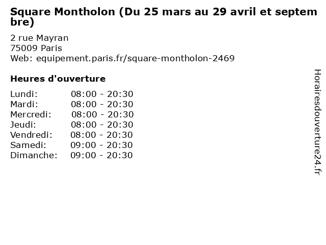 1 Square Montholon (Du 29 octobre au 28 février) (Distance: 0,00 km) 2 rue Mayran, 75009 Paris 28, 29, au, du, février, jardin, montholon, octobre, parc, square 2 Square Montholon (Du 01 au 24 mars) (Distance: 0,00 km) 2 rue Mayran, 75009 Paris 01, 24, au, du, jardin, mars, montholon, parc, square 3 Square Montholon (Du 30 avril au 31 août) (Distance: 0,00 km) 2 rue Mayran, 75009 Paris 30, 31, août, au, avril, du, jardin, montholon, parc, square 4 Onepark / Parking Montholon (Distance: 0,04 km) 3 Rue Mayran, 75009 Paris montholon, onepark, parking, services 5 Piscine Paul Valeyre (Du 21 août au 10 septembre) (Distance: 0,10 km) 24, rue de Rochechouart, 75009 Paris 10, 21, 2017, août, au, du, formation, paul, piscine, septembre, valeyre 6 Square Aristide-Cavaillé-Coll (Du 25 mars au 29 avril et septembre) (Distance: 0,47 km) 8 place Franz Liszt, 75010 Paris 25, 29, aristide, au, avril, cavaillé, coll, du, et, jardin, mars, parc, septembre, square |