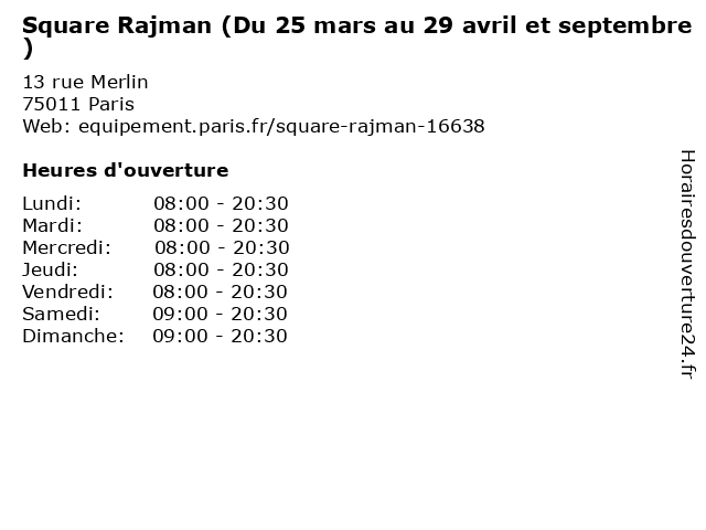 1 Square Rajman (Du 29 octobre au 28 février) (Distance: nan km) 13 rue Merlin, 75011 Paris 28, 29, au, du, février, jardin, octobre, parc, rajman, square 2 Square Rajman (Du 01 au 24 mars) (Distance: nan km) 13 rue Merlin, 75011 Paris 01, 24, au, du, jardin, mars, parc, rajman, square 3 Square Rajman (Du 30 avril au 31 août) (Distance: nan km) 13 rue Merlin, 75011 Paris 30, 31, août, au, avril, du, jardin, parc, rajman, square 4 Square de la Roquette (Du 25 mars au 29 avril et septembre) (Distance: 0,15 km) 143 rue de la Roquette, 75011 Paris 25, 29, au, avril, de, du, et, jardin, la, mars, parc, roquette, septembre, square 5 Crèche Associative Parentale Square Bande (Distance: 0,41 km) 5 Rue du Général Guilhem, 75011 Paris associative, band, bande, collective, crèche, crèches, parentale, services, services à la personne, square 6 Square Maurice-Gardette (Du 25 mars au 29 avril et septembre) (Distance: 0,50 km) 2 rue du Général-Blaise, 75011 Paris 25, 29, au, avril, du, et, gardette, jardin, mars, maurice, parc, septembre, square |