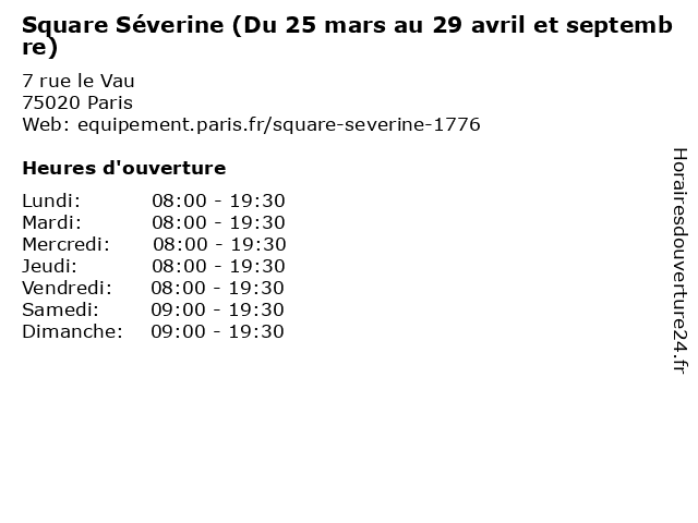 1 Square Séverine (Du 29 octobre au 28 février) (Distance: 0,00 km) 7 rue le Vau, 75020 Paris 28, 29, au, du, février, jardin, octobre, parc, square, séverine 2 Square Séverine (Du 01 au 24 mars) (Distance: 0,00 km) 7 rue le Vau, 75020 Paris 01, 24, au, du, jardin, mars, parc, square, séverine 3 Square Séverine (Du 30 avril au 31 août) (Distance: 0,00 km) 7 rue le Vau, 75020 Paris 30, 31, août, au, avril, du, jardin, parc, square, séverine 4 Square Emmanuel-Fleury (Du 25 mars au 29 avril et septembre) (Distance: 0,39 km) 40 rue Le Vau, 75020 Paris 25, 29, au, avril, du, emmanuel, et, fleury, jardin, mars, parc, septembre, square 5 Jardin Frida-Kahlo (Du 25 mars au 29 avril et septembre) (Distance: 0,55 km) - Rue Noisy-Le-Sec, 75020 Paris 25, 29, au, avril, du, et, frida, jardin, kahlo, mars, parc, septembre, square 6 Square Léon-Frapié (Du 25 mars au 29 avril et septembre) (Distance: 0,61 km) 5 rue Noisy-Le-Sec, 75020 Paris 25, 29, au, avril, du, et, frapié, jardin, léon, mars, parc, septembre, square |