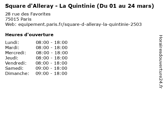1 Square d'Alleray - La Quintinie (Du 25 mars au 29 avril et septembre) (Distance: 0,00 km) 28 rue des Favorites, 75015 Paris 25, 29, au, avril, d'alleray, du, et, jardin, la, mars, parc, quintinie, septembre, square 2 Square d'Alleray - La Quintinie (Du 29 octobre au 28 février) (Distance: 0,00 km) 28 rue des Favorites, 75015 Paris 28, 29, au, d'alleray, du, février, jardin, la, octobre, parc, quintinie, square 3 Square d'Alleray - La Quintinie (Du 30 avril au 31 août) (Distance: 0,00 km) 28 rue des Favorites, 75015 Paris 30, 31, août, au, avril, d'alleray, du, jardin, la, parc, quintinie, square 4 Square Necker (Du 01 au 24 mars) (Distance: 0,28 km) 1 rue Tessier, 75015 Paris 01, 24, au, du, jardin, mars, necker, parc, square 5 Jardin Bargue-Platon (Du 01 au 24 mars) (Distance: 0,43 km) 126 rue Falguière, 75015 Paris 01, 24, au, bargue, du, jardin, mars, parc, platon, square 6 Jardin Bargue-Platon (Du 25 mars au 29 avril et septembre) (Distance: 0,43 km) 126 rue Falguière, 75015 Paris 25, 29, au, avril, bargue, du, et, jardin, mars, parc, platon, septembre, square |