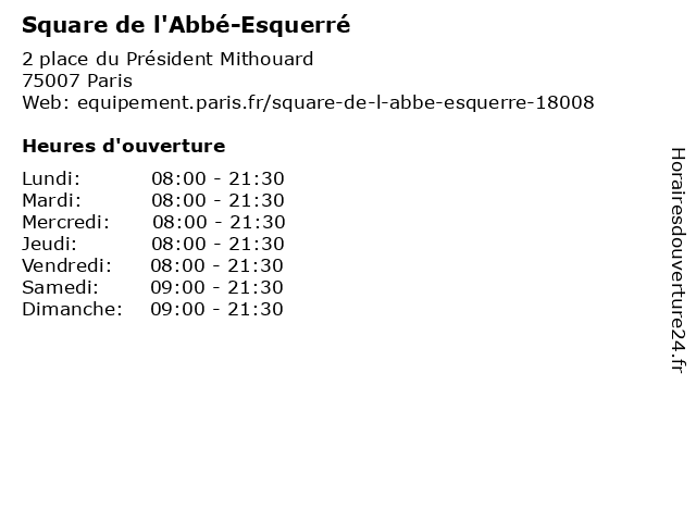1 Square Pierre-de-Gaulle (Du 29 octobre au 28 février) (Distance: 0,00 km) 2 place du Président Mithouard, 75007 Paris 28, 29, au, de, du, février, gaulle, jardin, octobre, parc, pierre, square 2 Square Pierre-de-Gaulle (Du 01 au 24 mars) (Distance: 0,00 km) 2 place du Président Mithouard, 75007 Paris 01, 24, au, de, du, gaulle, jardin, mars, parc, pierre, square 3 Square Pierre-de-Gaulle (Du 25 mars au 29 avril et septembre) (Distance: 0,00 km) 2 place du Président Mithouard, 75007 Paris 25, 29, au, avril, de, du, et, gaulle, jardin, mars, parc, pierre, septembre, square 4 Boucherie de L'Abbé Grégoire (Distance: 0,92 km) 29 Rue de l'Abbé Grégoire, 75006 Paris artisan, boucher, boucherie, charcuterie, charcutier, de, grégoire, l'abbé, poissonnerie, rotisserie, viande 5 Restaurant Le Square (Distance: 0,94 km) 31, Rue Saint-Dominique, 75007 Paris dessert, food, le, restaurant, square 6 Square Ozanam (Du 29 octobre au 28 février) (Distance: 1,34 km) 18 rue Stanislas, 75006 Paris 28, 29, au, du, février, jardin, octobre, ozanam, parc, square |