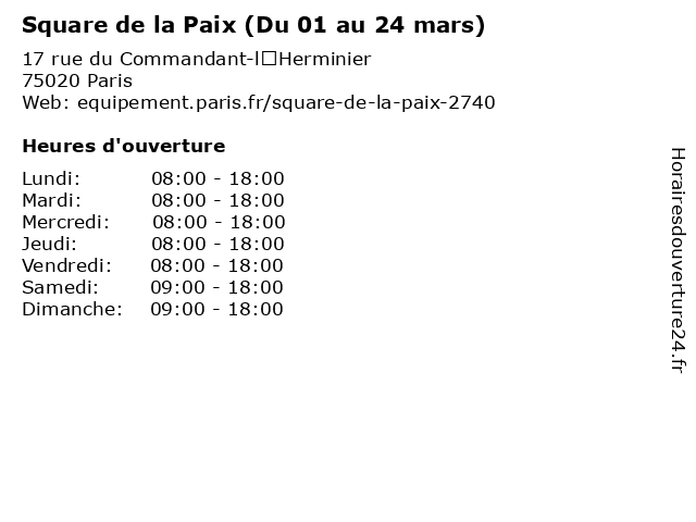1 Square de la Paix (Du 25 mars au 29 avril et septembre) (Distance: 0,00 km) 17 rue du Commandant-l’Herminier, 75020 Paris 25, 29, au, avril, de, du, et, jardin, la, mars, paix, parc, septembre, square 2 Square de la Paix (Du 29 octobre au 28 février) (Distance: 0,00 km) 17 rue du Commandant-l’Herminier, 75020 Paris 28, 29, au, de, du, février, jardin, la, octobre, paix, parc, square 3 Square de la Paix (Du 30 avril au 31 août) (Distance: 0,00 km) 17 rue du Commandant-l’Herminier, 75020 Paris 30, 31, août, au, avril, de, du, jardin, la, paix, parc, square 4 Thevenin & Ducrot - Avia (libre service 24/24) (Distance: 0,14 km) 186 Avenue Galliéni, 94160 Saint Mandé 24/24, accessoires, avia, ducrot, libre, motos, service, services, stations, thevenin, voitures 5 Square Réjane (Du 01 au 24 mars) (Distance: 0,84 km) 58 rue de Lagny, 75020 Paris 01, 24, au, du, jardin, mars, parc, réjane, square 6 Square Réjane (Du 25 mars au 29 avril et septembre) (Distance: 0,84 km) 58 rue de Lagny, 75020 Paris 25, 29, au, avril, du, et, jardin, mars, parc, réjane, septembre, square |