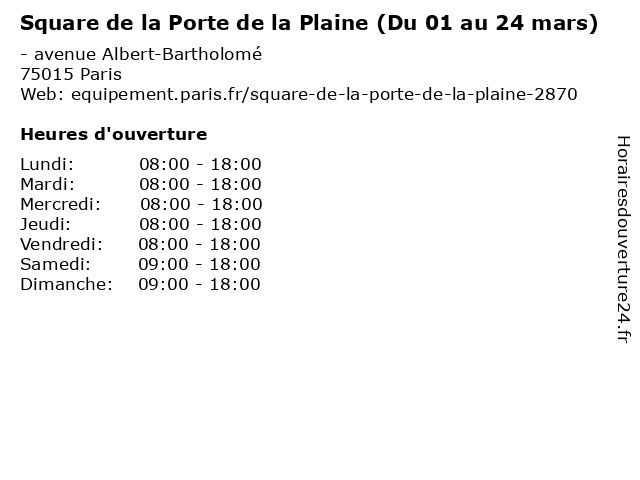 1 Square de la Porte de la Plaine (Du 25 mars au 29 avril et septembre) (Distance: 0,00 km) - avenue Albert-Bartholomé, 75015 Paris 25, 29, au, avril, de, du, et, jardin, la, mars, parc, plaine, porte, septembre, square 2 Square de la Porte de la Plaine (Du 29 octobre au 28 février) (Distance: 0,00 km) - avenue Albert-Bartholomé, 75015 Paris 28, 29, au, de, du, février, jardin, la, octobre, parc, plaine, porte, square 3 Square de la Porte de la Plaine (Du 30 avril au 31 août) (Distance: 0,00 km) - avenue Albert-Bartholomé, 75015 Paris 30, 31, août, au, avril, de, du, jardin, la, parc, plaine, porte, square 4 MSP du Square Calmette (Distance: 0,06 km) 10 10 Rue Andre Theuriet, 75015 PARIS calmette, du, msp, square 5 Square du docteur Calmette (Du 01 au 24 mars) (Distance: 0,14 km) 2 rue Jean Sicard, 75015 Paris 01, 24, au, calmette, docteur, du, jardin, mars, parc, square 6 Square des Périchaux (Distance: 0,17 km) 121 boulevard Lefebvre, 75015 Paris des, jardin, parc, périchaux, square |