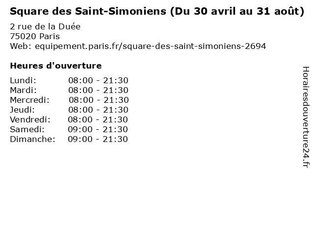 1 Square des Saint-Simoniens (Du 29 octobre au 28 février) (Distance: 0,00 km) 2 rue de la Duée, 75020 Paris 28, 29, au, des, du, février, jardin, octobre, parc, saint, simoniens, square 2 Square des Saint-Simoniens (Du 01 au 24 mars) (Distance: 0,00 km) 2 rue de la Duée, 75020 Paris 01, 24, au, des, du, jardin, mars, parc, saint, simoniens, square 3 Square des Saint-Simoniens (Du 25 mars au 29 avril et septembre) (Distance: 0,00 km) 2 rue de la Duée, 75020 Paris 25, 29, au, avril, des, du, et, jardin, mars, parc, saint, septembre, simoniens, square 4 Jardin Pierre-Seghers (Du 30 avril au 31 août) (Distance: 0,20 km) 24 rue Hélène Jakubowicz, 75020 Paris 30, 31, août, au, avril, du, jardin, parc, pierre, seghers, square 5 Jardin du Regard de la Lanterne (Du 30 avril au 31 août) (Distance: 0,62 km) 3 rue Augustin Thierry, 75019 Paris 30, 31, août, au, avril, de, du, jardin, la, lanterne, parc, regard, square 6 Jardin des Couronnes (Du 30 avril au 31 août) (Distance: 0,76 km) - rue des Couronnes, 75020 Paris 30, 31, août, au, avril, couronnes, des, du, jardin, parc, square |
