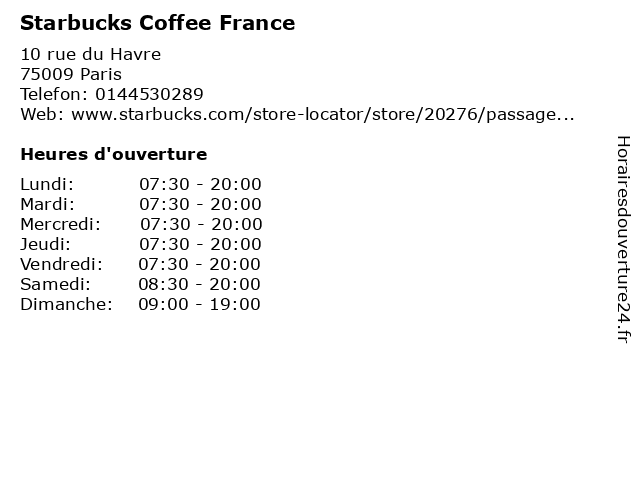 1 Starbucks Coffee France (Distance: 0,08 km) 106 b Rue Saint Lazare, 75008 Paris coffee, france, restaurants, starbucks 2 Starbucks Coffee France (Distance: 0,24 km) 2 Rue De La Pepiniere, 75008 Paris coffee, france, restaurants, starbucks 3 Starbucks Coffee France (Distance: 0,50 km) 4 Rue De Seze, 75009 Paris coffee, france, restaurants, starbucks 4 Starbucks Coffee France (Distance: 0,93 km) 4 Place De Clichy, 75009 Paris coffee, france, restaurants, starbucks 5 Starbucks Coffee France (Distance: 1,07 km) 18 Boulevard Montmartre, 75009 Paris coffee, france, restaurants, starbucks 6 Starbucks Coffee France (Distance: 1,50 km) Carrousel Du Louvre, 75001 Paris coffee, france, restaurants, starbucks |
