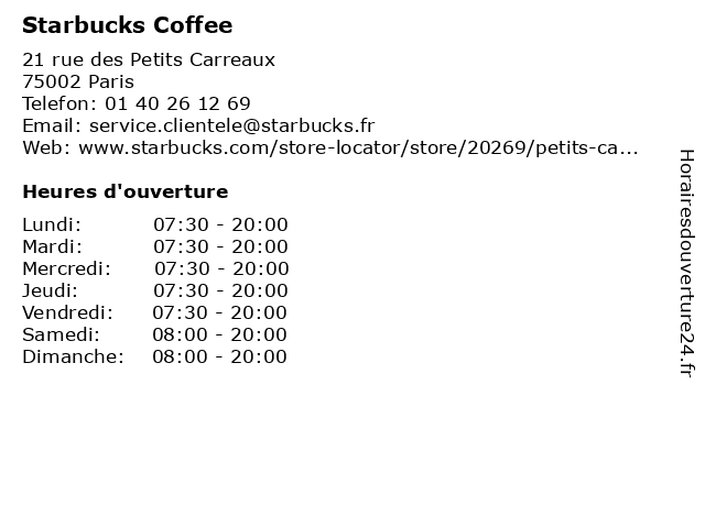 1 Starbucks Coffee (Distance: 0,56 km) 1 place de la Rotonde, 75001 Paris cafe, café, coffee, coffee shop, coffee store, starbucks 2 Starbucks Coffee (Distance: 0,60 km) 77 rue Rambuteau, 75001 Paris cafe, café, coffee, coffee shop, coffee store, starbucks 3 Starbucks Coffee (Distance: 0,79 km) 4, rue Aubry le Boucher, 75004 Paris cafe, café, coffee, coffee shop, coffee store, starbucks 4 Starbucks Coffee (Distance: 0,92 km) 11 boulevard de Sébastopol, 75001 Paris cafe, café, coffee, coffee shop, coffee store, starbucks 5 Starbucks Coffee (Distance: 0,93 km) 26 avenue de l'Opéra, 75001 Paris boisson, café, coffee, milkshake, starbucks, thé 6 Starbucks Coffee (Distance: 1,02 km) 67 Rue La Fayette, 75009 Paris boisson, café, coffee, milkshake, starbucks, thé |