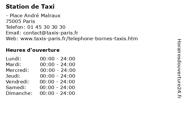 1 Station de Taxi (Distance: 0,00 km) - Place André Malraux, 75001 Paris de, station, taxi, trajets, voyages 2 Station de Taxi (Distance: 0,44 km) 4bis Place des Victoires, 75002 Paris de, station, taxi, trajets, voyages 3 Station de Taxi (Distance: 0,73 km) - Place de l'Opéra, 75002 Paris de, station, taxi, trajets, voyages 4 Station de Taxi (Distance: 0,84 km) 252 Rue de Rivoli, 75001 Paris de, station, taxi, trajets, voyages 5 Station de Taxi (Distance: 1,10 km) - Place du Châtelet, 75001 Paris de, station, taxi, trajets, voyages 6 |