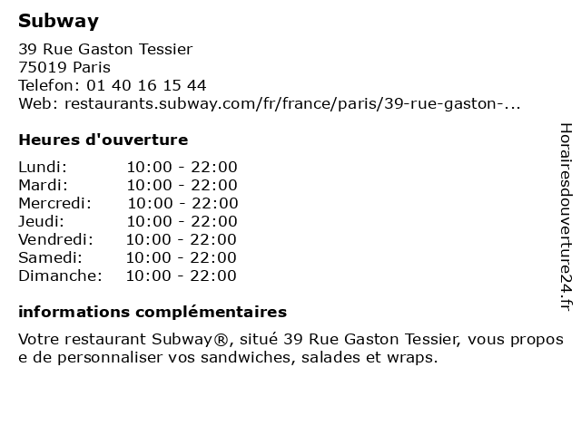 3 Subway (Distance: 4,72 km) 1 Place Du Caquet, 93200 Saint-Denis cafe, chaussures, enfants, homme, mode femme, parfumeries, restaurant, servicies, sport, subway 4 Subway (Distance: 4,91 km) 59 rue du Faubourg Saint Antoine, 75011 Paris alimentaires, boissons, restaurant, restauration rapide, subway 5 Subway (Distance: 5,49 km) 235 Rue Etienne Marcel, 93556 Montreuil accessoires, cafe, chaussures, hauts, homme, lingerie, mode femme, restaurant, subway 6 Subway (Distance: 5,53 km) 7 Rue Michel Chasles, 75012 Paris fast-food, restaurant à emporter, restaurants, subway  |