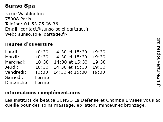 | 1 Sunso Spa (Distance: 5,34 km) 31 passage de l'Arche, 92800 Puteaux beauté soins, bronzage, institut, massage, spa, sunso, épilation 5 C WHITE - Fitness & Spa (Distance: 0,55 km) 127 rue du Faubourg Saint-Honoré, 75008 Paris beauté, cwhite, fitness, institut, personnel, soins, spa, white 6 Sokha Royal Spa Miromesnil - Thaï massage & Spa (Distance: 1,04 km) 17 Rue de Miromesnil, 75008 Paris massage, miromesnil, royal, sokha, spa, thaï |