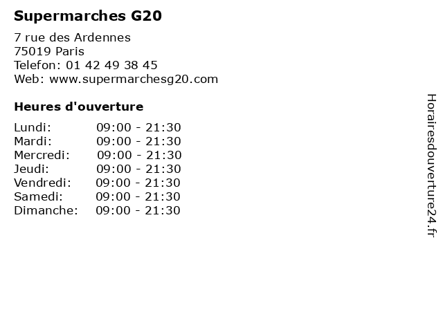 1 Supermarches G20 (Distance: 0,44 km) 200 avenue Jean Jaurès, 75019 Paris g20, ipermercati, supermarches, supermercati 2 Supermarches G20 (Distance: 0,73 km) 136 Avenue de Flandre, 75019 Paris g20, ipermercati, supermarches, supermercati 3 Supermarches G20 (Distance: 3,67 km) 114 RUE Damremont, 75018 Paris g20, ipermercati, supermarches, supermercati 4 Supermarches G20 (Distance: 6,20 km) 245, Boulevard de la Boissière, 93110 Rosny sous bois g20, ipermercati, supermarches, supermercati 5 Supermarches G20 (Distance: 7,75 km) 46 rue saint Didier, 75016 Paris g20, ipermercati, supermarches, supermercati 6 Supermarches G20 (Distance: 10,00 km) 7 boulevard Chastenet de Géry, 94800 Villejuif g20, ipermercati, supermarches, supermercati |