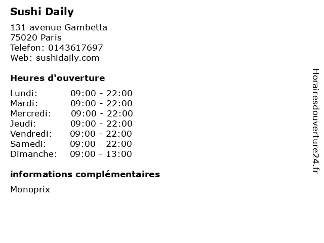 1 Sushi Daily (Distance: 1,11 km) 9 Rue Louise Thuliez, 75019 Paris daily, emporter, japonais, makis, restaurant, sushi, vente 2 Sushi Daily (Distance: 2,15 km) 20 Boulevard de Charonne, 75020 Paris daily, emporter, japonais, makis, restaurant, sushi, vente 3 Sushi Daily (Distance: 4,88 km) . place de l'Europe, 94220 Charenton-le-Pont daily, emporter, japonais, makis, restaurant, sushi, vente 4 Sushi Daily (Distance: 5,60 km) 10 Rue Westermeyer, 94400 Ivry-sur-Seine daily, emporter, japonais, makis, restaurant, sushi, vente 5 6 Sushi Daily (Distance: 5,67 km) . Avenue du Général de Gaulle, 93110 Rosny-sous-Bois daily, emporter, japonais, makis, restaurant, sushi, vente |
