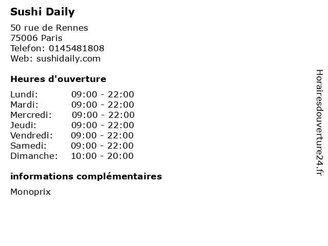 1 Sushi Daily (Distance: 0,59 km) . Rue du Bac, 75007 Paris daily, emporter, japonais, makis, restaurant, sushi, vente 2 Sushi Daily (Distance: 1,54 km) 31 rue du Départ, 75014 Paris daily, emporter, japonais, makis, restaurant, sushi, vente 3 Sushi Daily (Distance: 3,16 km) 30 avenue d'Italie, 75013 Paris daily, emporter, japonais, makis, restaurant, sushi, vente 4 Sushi Daily (Distance: 3,16 km) 30 avenue d'Italie, 75013 Paris daily, emporter, japonais, makis, restaurant, sushi, vente 5 Sushi Daily (Distance: 3,19 km) 99 rue du Faubourg Saint-Antoine, 75011 Paris daily, emporter, japonais, makis, sushi, vente 6 Sushi Daily (Distance: 3,23 km) 165 Rue Nationale, 75013 Paris daily, emporter, japonais, makis, restaurant, sushi, vente |
