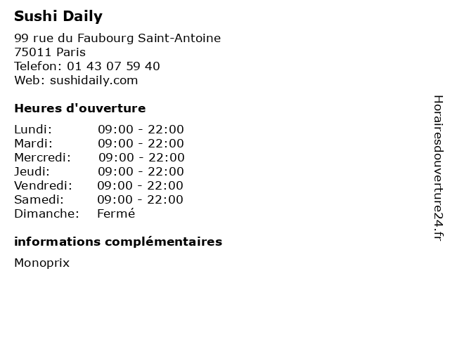 1 Sushi Daily (Distance: 1,72 km) 20 Boulevard de Charonne, 75020 Paris daily, emporter, japonais, makis, restaurant, sushi, vente 2 Sushi Daily (Distance: 2,18 km) 125 Boulevard Vincent Auriol, 75013 Paris daily, emporter, japonais, makis, restaurant, sushi, vente 3 Sushi Daily (Distance: 2,37 km) 165 Rue Nationale, 75013 Paris daily, emporter, japonais, makis, restaurant, sushi, vente 4 Sushi Daily (Distance: 2,90 km) 30 avenue d'Italie, 75013 Paris daily, emporter, japonais, makis, restaurant, sushi, vente 5 Sushi Daily (Distance: 3,19 km) 50 rue de Rennes, 75006 Paris daily, emporter, japonais, makis, restaurant, sushi, vente 6 Sushi Daily (Distance: 3,94 km) 10 Rue Westermeyer, 94400 Ivry-sur-Seine daily, emporter, japonais, makis, restaurant, sushi, vente |