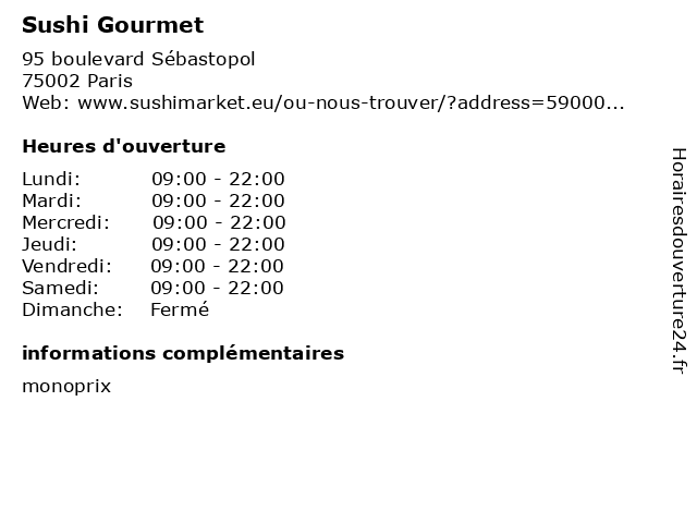 1 Sushi Gourmet (Distance: 0,69 km) 164 Rue du Temple, 75003 Paris crus, gourmet, japonais, maki, restaurant, sushi 2 Sushi Gourmet (Distance: 1,34 km) 23 Avenue de l'Opéra, 75001 Paris crus, gourmet, japonais, maki, restaurant, sushi 3 Sushi Gourmet (Distance: 1,73 km) 11 Rue Scribe, 75009 Paris crus, gourmet, japonais, maki, restaurant, sushi 4 Sushi Gourmet (Distance: 2,89 km) 6 rue Delouvain, 75019 Paris crus, gourmet, japonais, maki, restaurant, sushi 5 Sushi Gourmet (Distance: 3,47 km) 161 rue de Menilmontant, 75020 Paris asiatique, chinois, chinoise, gourmet, rapide, restaurant, restauration, sushi, sushis, thai 6 Sushi Gourmet (Distance: 3,98 km) 191 Boulevard Macdonald, 75019 Paris crus, gourmet, japonais, maki, restaurant, sushi |