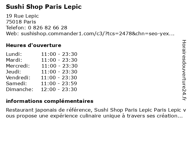 1 Délices Lepic (Distance: 0,04 km) 14 Rue Lepic, 75018 Paris chinois, délices, lepic, po, restaurants, wok, yu, zheng 2 Sushi Shunei (Distance: 0,13 km) 3 Rue Audran, 75018 Paris japonais, makis, restaurant, saké, shunei, sushi, sushis 3 Sushi Takasaki (Distance: 0,26 km) 46 Boulevard de Clichy, 75018 Paris japonais, livraison, makis, poisson, restaurant, riz, sushi, takasaki 4 5 One More Sushi (Distance: 0,64 km) 28 Rue Jean Baptiste Pigalle, 75009 Paris bar, bistro, bistrot, brasserie, café, more, one, pub, restaurant, restauration, resto, sushi 6 |