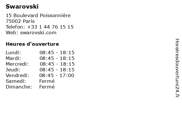 1 Swarovski (Distance: 0,99 km) 101 Rue Berger, 75001 Paris accesoires, bijoux, diamants, montblanc, montres, or, swarovski 4 Swarovski (Distance: 1,50 km) 13 Rue d'Amsterdam, 75008 Paris cafe, chaussures, enfants, homme, mode femme, restaurant, service, sport, swarovski 5 Swarovski (Distance: 1,66 km) 1 Cour de Rome, 75008 Paris alimentation, beauté & sante, culture & loisirs, enfants, high-tech, maison & déco, mode, restaurants, swarovski 6 Swarovski (Distance: 4,25 km) 31 Rue d Alsace, 92300 Levallois alimentation, beauté & santé, culture & loisirs, enfants, high-tech, maison & déco, mode, restaurants, swarovski |